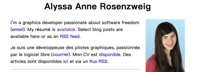 翻开 Alyssa 的个人博客主页,映入眼帘的自我介绍相当简洁:一位专注图形驱动的开发者,同时也是软件自由的忠实拥护者。