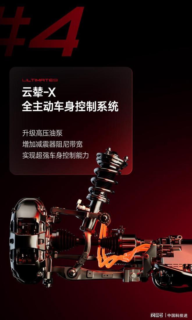 三是云辇-X智能全主动车身控制系统,这是全球首个高电压全主动悬架系统,可以实现垂直方向上的悬架快速调节,使车身更平稳抓地,保证车辆稳定性与安全。
