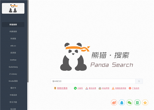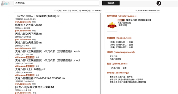 这个是一个大而全的搜索引擎, 除了分类检索以外, 还集成了多个网站的电子书搜索引擎, 它并不是如同通用搜索那样爬虫信息, 而且直接集成了别家的搜索器。鸠摩搜书,快搜猫, 阅读链, Gutenberg,Kindle漫画,苦瓜书盘等等。