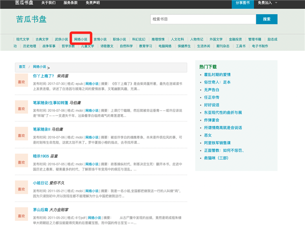 苦瓜书盘是最好的一个电子书资源网址, 这里提供MOBI格式的电子书, 这个格式可以直接导入到Kindle, 或者苹果手机阅读。 这里除了搜索, 这里还直接提供了几十个分类, 方便检索。