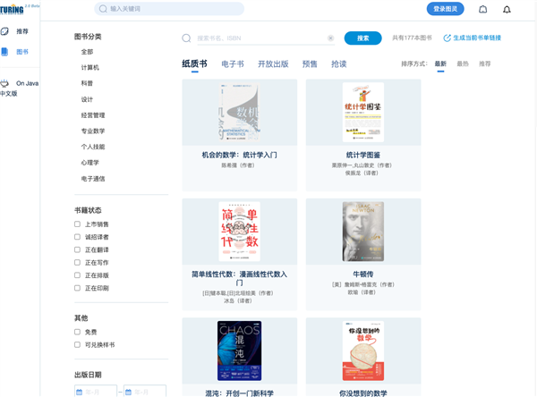 书籍的一个大而全的搜索引擎, 推荐过很多次, 搜索界面非常简朴, 甚至和十几年前的网站差不多, 但资源总类多, 而且非常全, 支持非常多种格式的电子书, 免费不限次数使用, 也是我最常使用的一个站点。