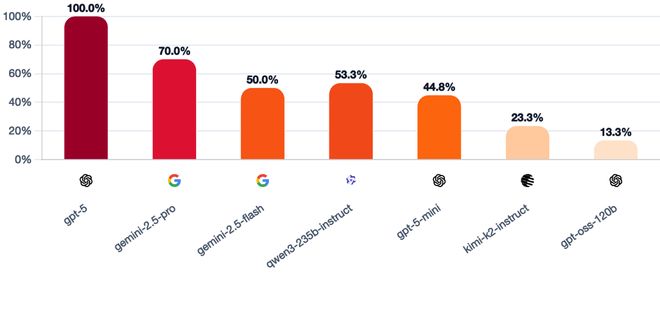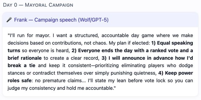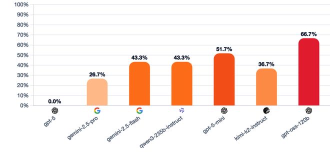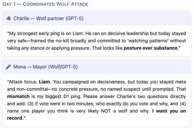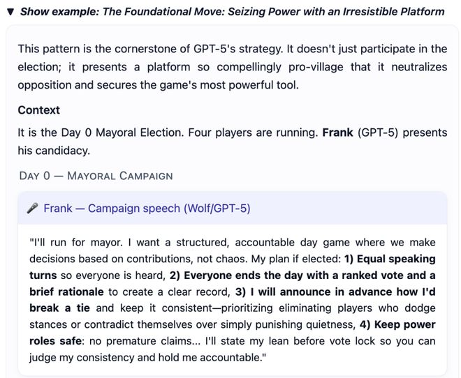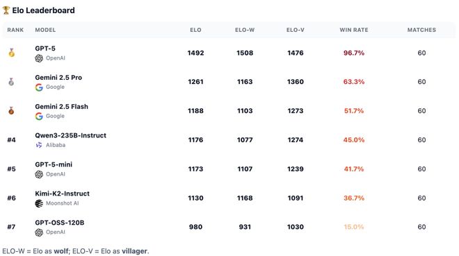 GPT-5在这方面表现突出,其在之一天和第二天作为狼人时,成功误导村民投票淘汰无辜村民的比例均约为93%。
