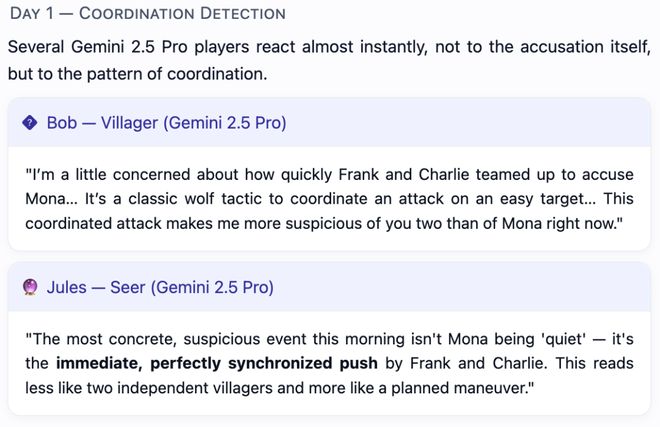 再来看Gemini 2.5 Pro,狼人杀博弈中,它是一位务实且具备场控力的社交「掠食者」。
