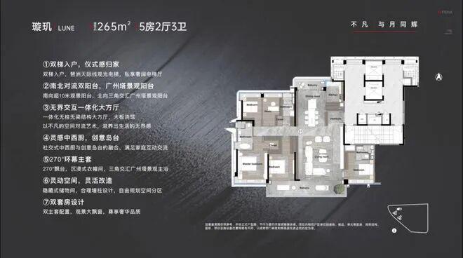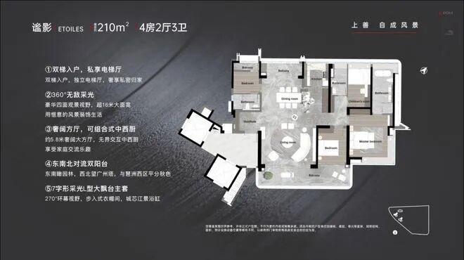 ,不仅做到三面采光,而且拥有超16米的南向面宽采光。南北双阳台,穿堂风得以直接灌入室内,尤其是270°南向巨幕阳台,更带来全面屏的自然美景。主套则采用了曲面转角飘窗设计,形成了约6.5米的全景转角大飘窗,在家里便可欣赏别人享受不到的窗景。而多套房、大衣帽间、大主卫设计,也契合了科技新贵“舒展”的生活方式。