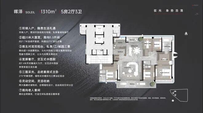,感受优雅生活背后的细腻匠心。建面约310㎡户型,做出了超20米的南向大面宽,全面屏采光。约11.8米宽景阳台,成为天然的取景器,而每一个转身,也都能与明媚的阳光不期而遇。