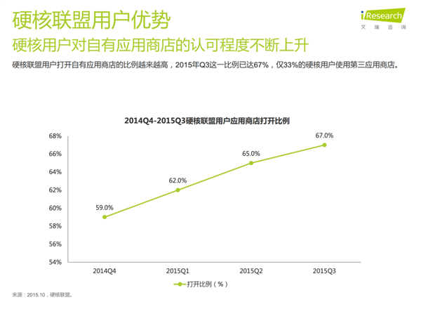2015 年第三季度,硬核联盟用户打开官方 App 商店比例就上升到了 67%。5 年后,联盟应用商店渗透率更是达到 64.38%,为所有分发平台中更高。