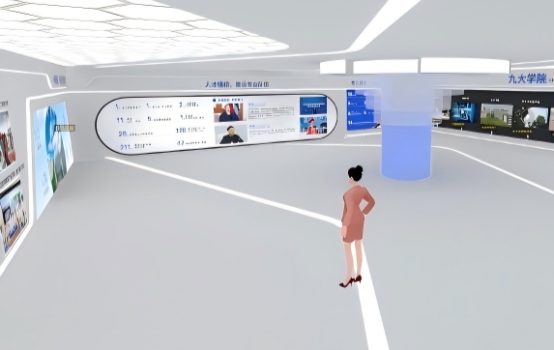 ③AI数字人接待。平台虚拟校史馆展厅内可配置AI数字人,AI数字人能够自动讲解,7X24 小时全天候接待,方便高效。