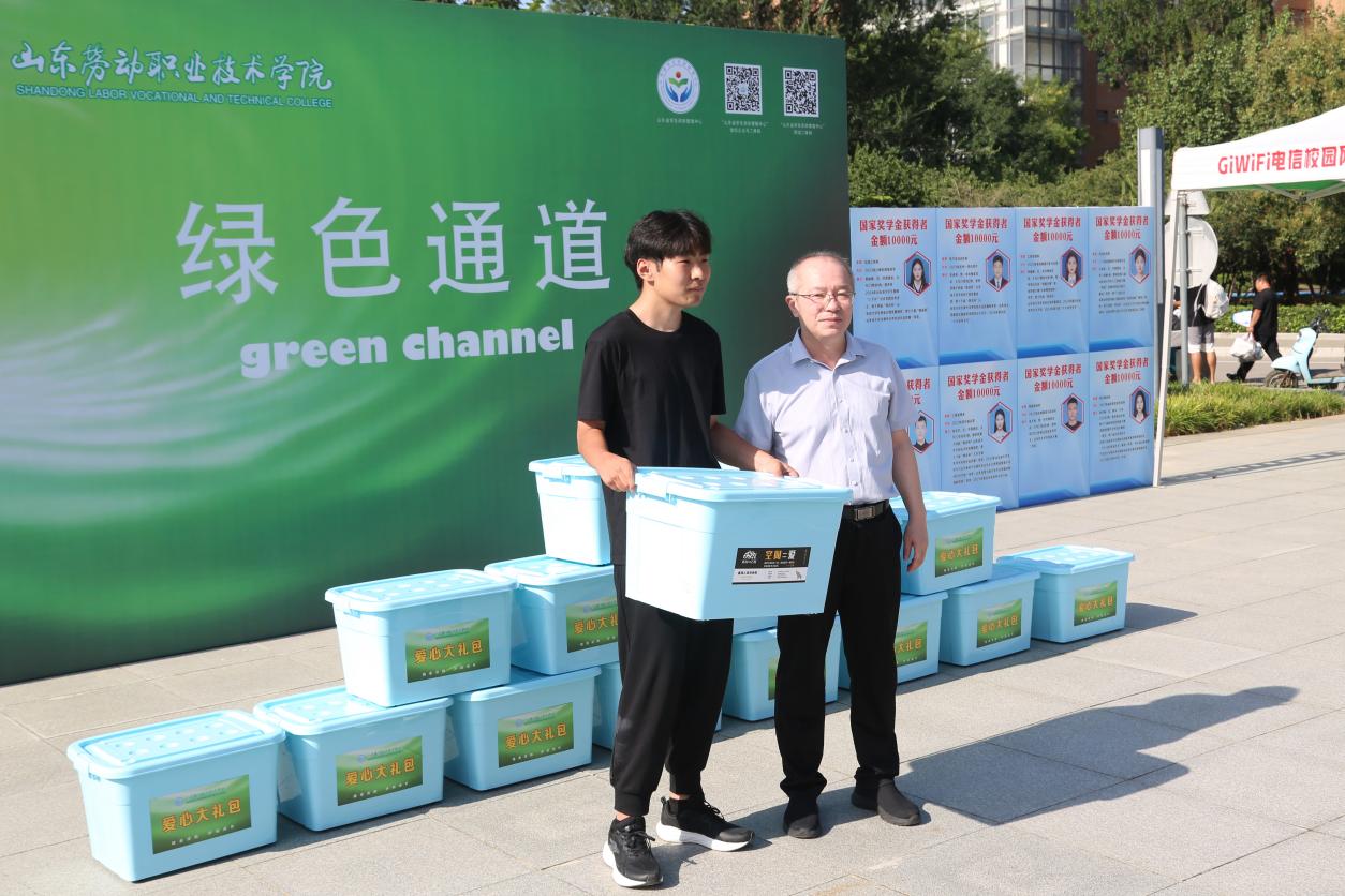 迎新过程中,学院领导来到长清校区专门设置的“绿色通道”服务区看望学生,详细询问他们的家庭情况与入学需求,并发放爱心大礼包。