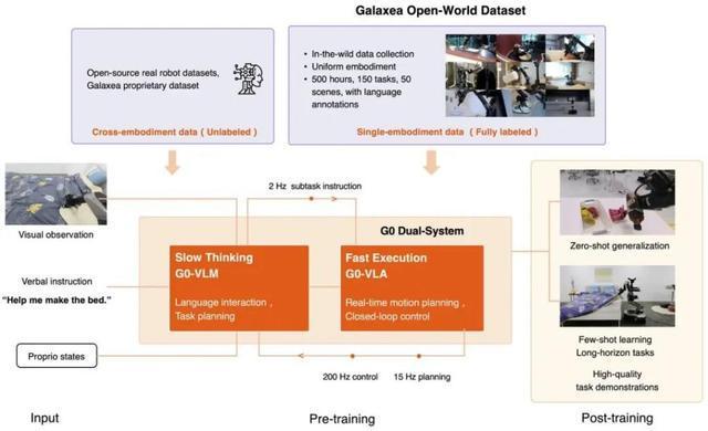 G0模型采用“双系统”架构,以“慢思考、快执行”为核心理念,借鉴生物进化中大脑皮层与小脑不同频率运作的分工机制,实现能量利用效率更优。
