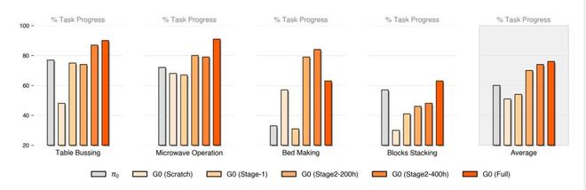 与当前主流开源模型相比,G0模型在多项任务中表现优于π0,并在部分任务上实现了高达 20% 的性能提升。在仅使用 100 条任务轨迹进行微调的条件下,结合跨本体与单本体预训练的 G0(Full)模型在平均进度得分上表现更佳,全面超越Benchmark模型π0,尤其在物体拾取与放置任务中优势明显。
