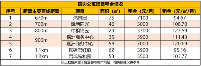 目前距离本项目约700m的45㎡产品的月租金可达5000元,同时周边73㎡产品的月租金可达7000元。