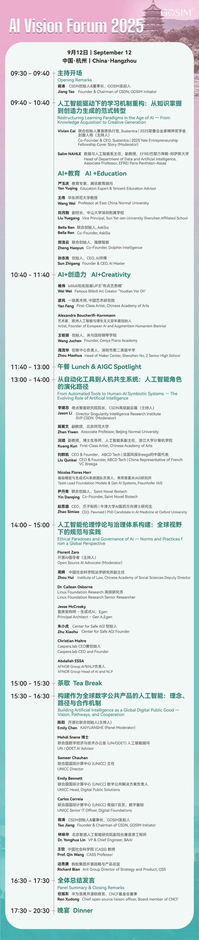 高端论坛包括两场,其中,GOSIM AI Vision Forum由 GOSIM 全球开源创新汇与全法中国青年科创协会联合主办,深入探究 AI 与社会、教育、艺术、伦理、及人类发展的共生关系,为紧随其后的技术盛会奠定思想基石。
