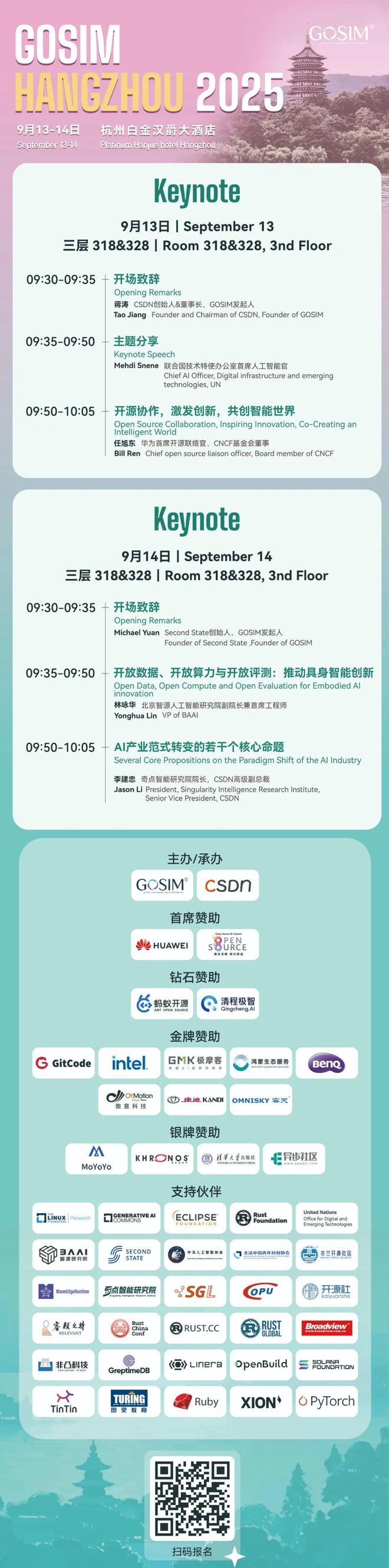 的鲜明特色,金秋九月,来自全球的 200+ 开源与 AI 技术领袖将齐聚西湖之畔,共同开启一场高规格、面向未来的开源愿景与实践盛会。