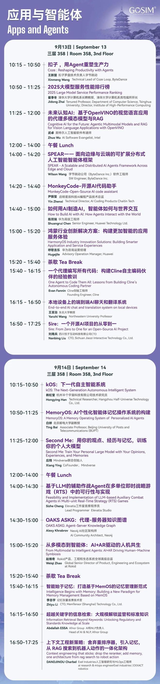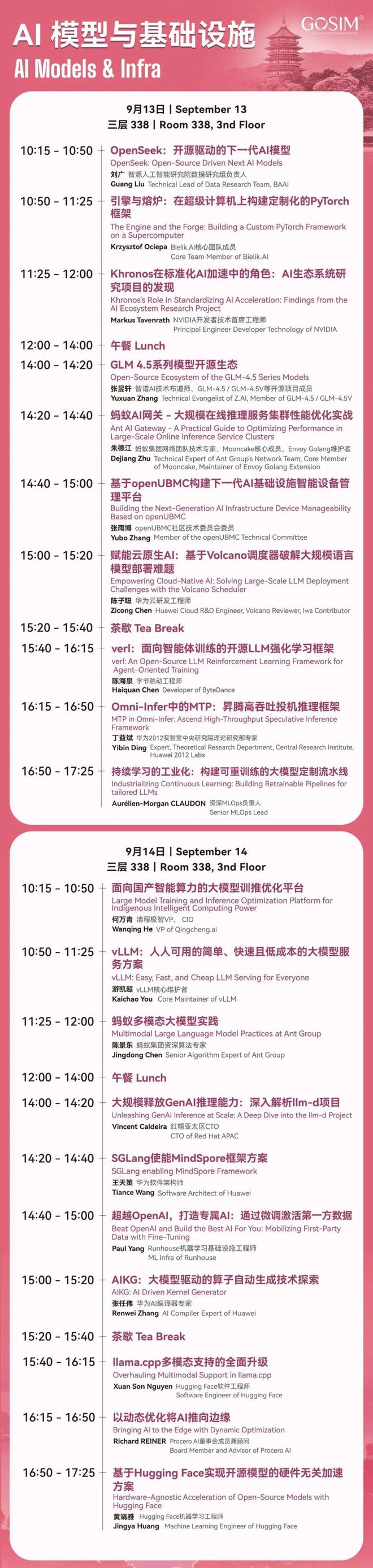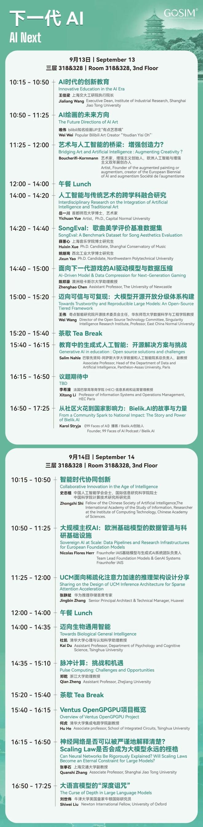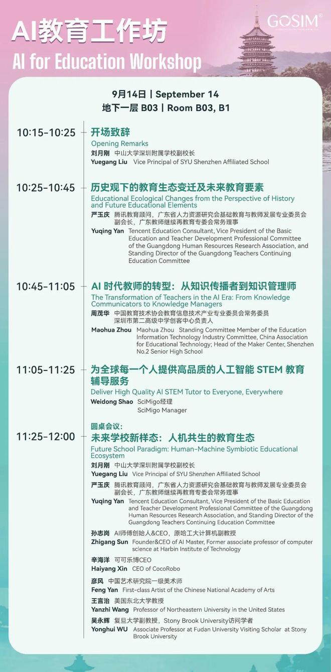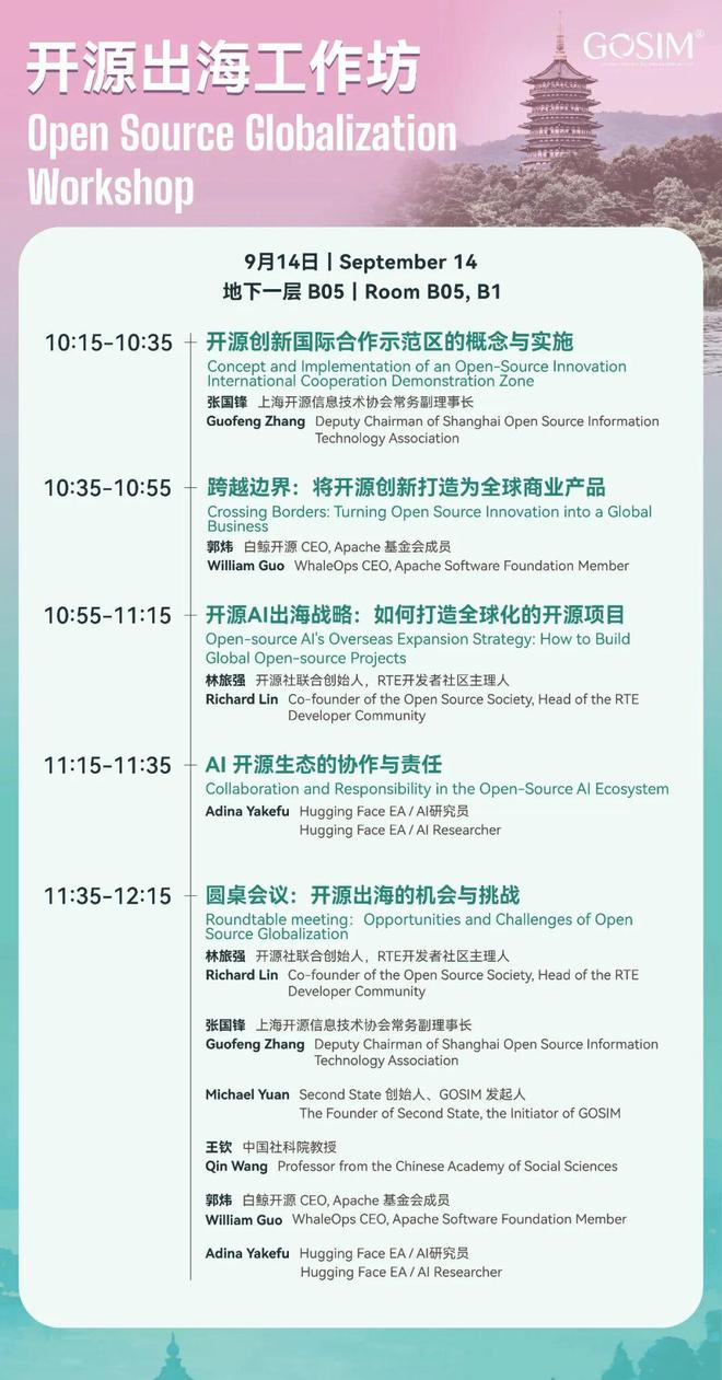 9 月 14 日上午,AI 教育工作坊探讨智能技术赋能教育的创新模式;开源出海工作坊分享中国开源项目走向全球的经验与路径。