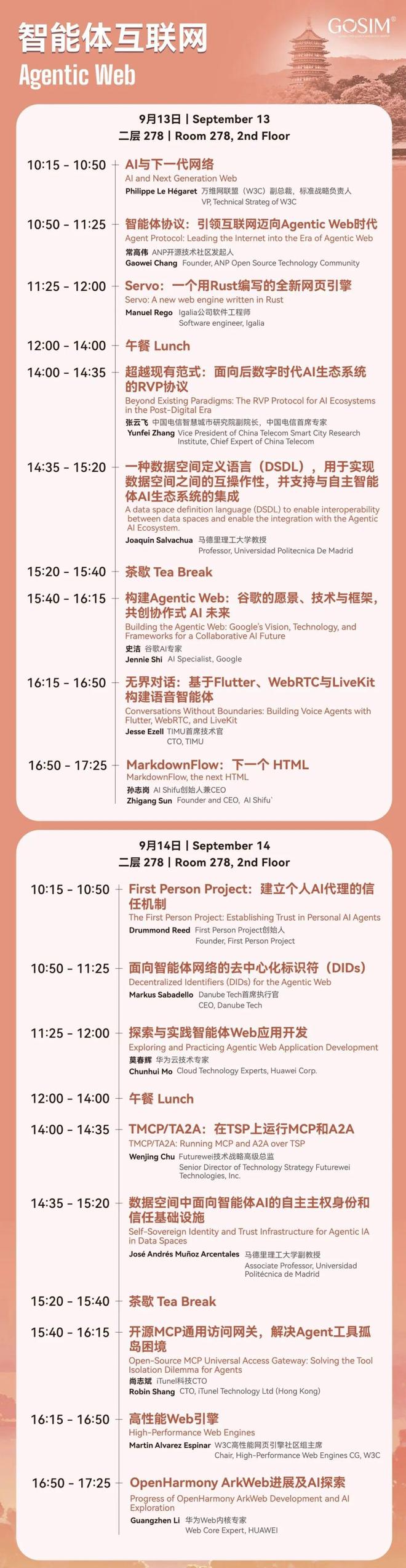 「智能体互联网」主题 论 坛将迎来谷歌、W3C 去中心化身份基金会指导委员会、马德里理工大学、ANP 开源技术社区、Futurewei、中国电信智慧城市研究院等 全球顶尖机构与企业的权威专家,论坛围绕智能体互联网的 “安全信任”“协议标准”“技术落地” 三大维度,为智能体互联网的发展提供了多维度的思路与方向。