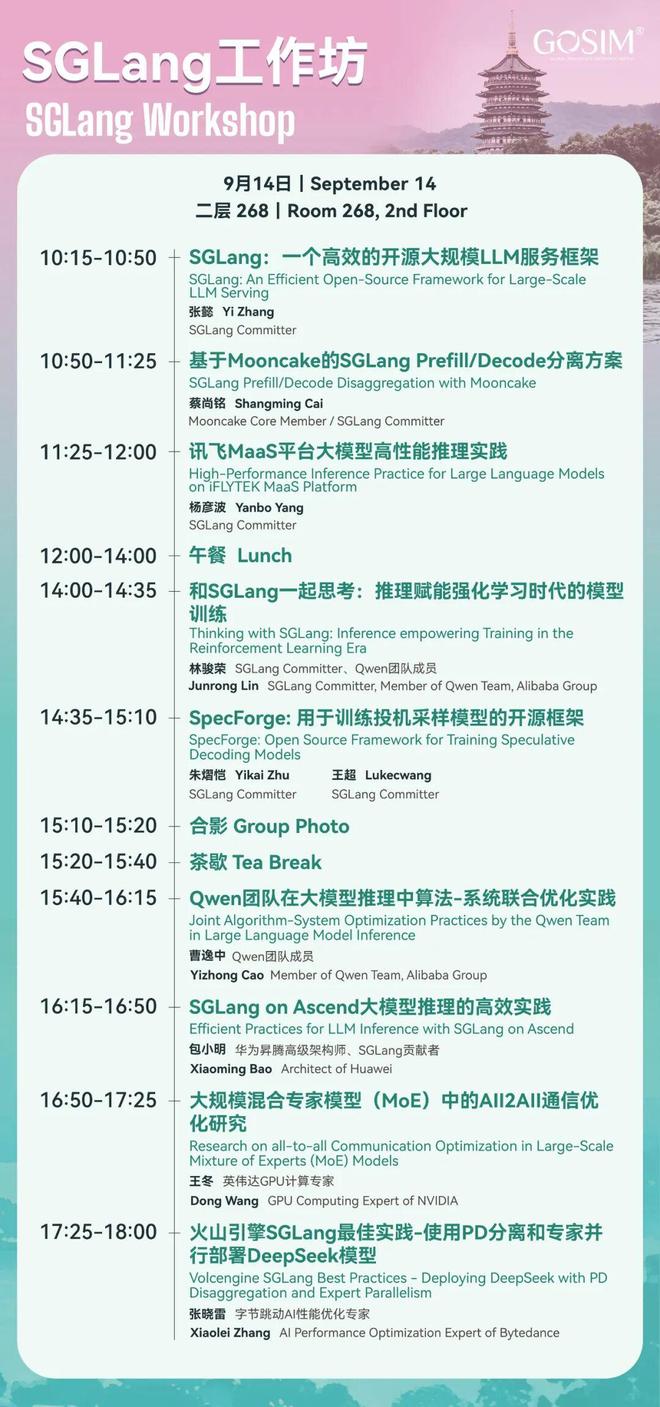 9 月 14 日一整天,大模型领域最著名、热度更高、DeepSeek 推荐使用的开源推理引擎之一——国内的首场SGLang Workshop震撼开启;Dora 工作坊则聚焦机器人,从不同角度探索对 Dora-rs 的理解与应用。