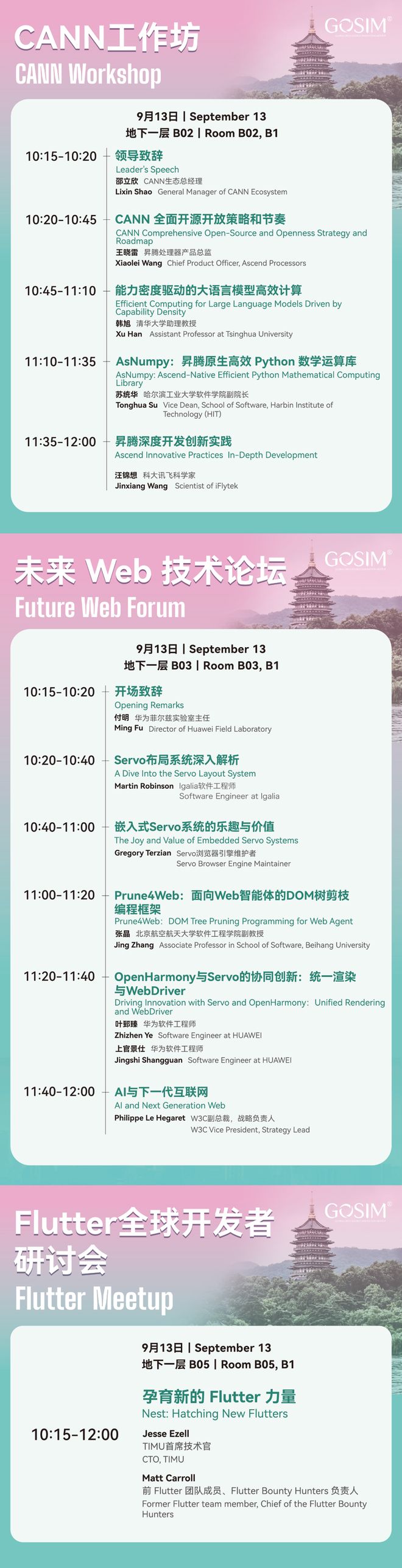 9 月 13 日上午,CANN 工作坊将带来昇腾计算与高性能推理实践;未来 Web 技术论坛聚焦 Web 内核与 AI 智能体结合的最新技术与实践 ;Flutter 全球开发者研讨会分享跨平台应用的最新进展。