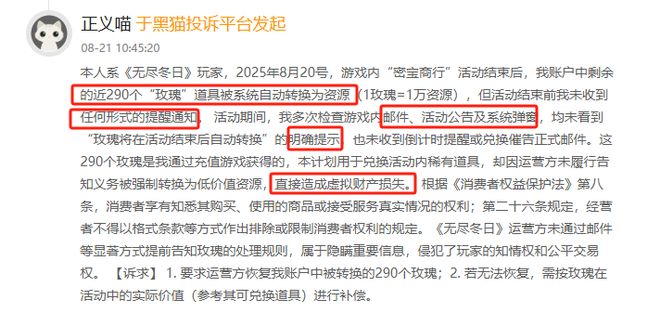 在本月中,有多名网友在黑猫平台上反馈称:玩家在无尽冬日 “密宝商行” 活动结束后,账户内 290 个充值获得的 “玫瑰”(原计划兑换稀有道具)被自动转换为资源(1 玫瑰 = 1 万资源),活动前未收到邮件、公告、弹窗等任何玫瑰自动转换提醒(含倒计时、兑换催告),强制转换致虚拟财产损失。截至目前,无尽冬日手游累计投诉633件,回复率为0%。