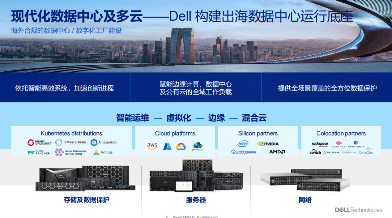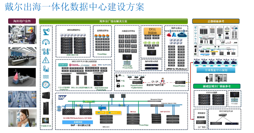 在出海企业中,约70%选择SAPHANA作为核心系统。作为SAP全球合作伙伴,戴尔科技拥有丰富的HANA出海实施经验;在制造领域,联合西门子、ABB等生态伙伴,提供MES系统集成与跨国交付支持;针对轻资产需求,提供基于红帽、VMware的混合云解决方案及MicrosoftAzure连接方案,并配套数据合规部署建议,助力企业安全高效地实现全球业务数字化。