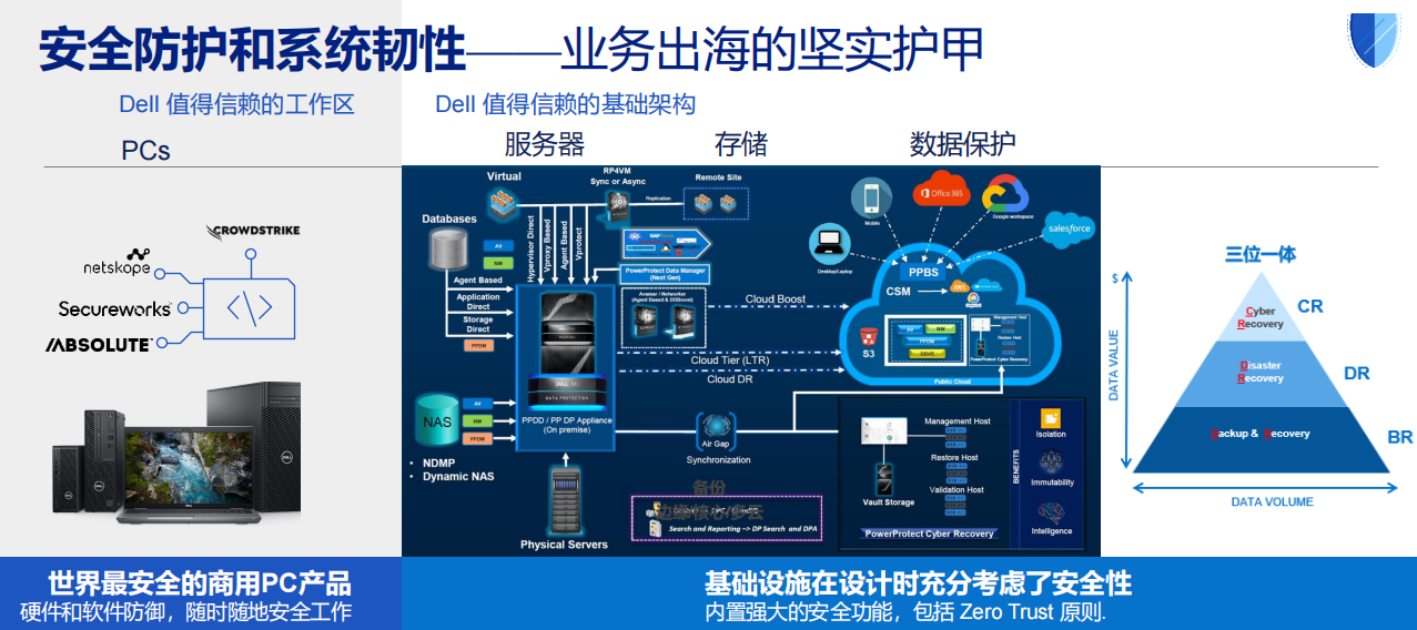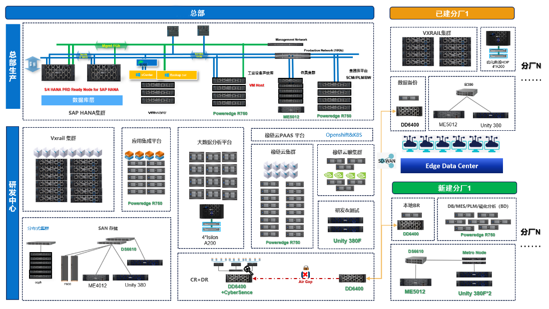 戴尔科技为其定制“多站点容灾+双活数据中心+数据避风港”整体解决方案:在产线端部署双活数据中心,配合DD备份加密技术与远程容灾策略,构建起边缘端BR、总部数据中心侧多站点DR+CR保护的三重数据防护体系。该方案既支撑了MES、BigData等业务系统的全面升级,又解决了用户数据集中管理与核心业务数据安全的难题。