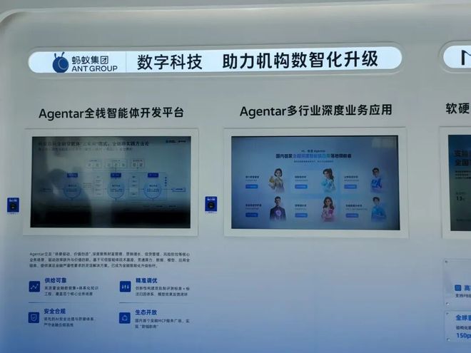 在阿里展台的另一边,其“近亲”蚂蚁集团也在智能体领域展现出最新研究成果。记者现场了解到,蚂蚁集团旗下蚂蚁数科Agentar全栈企业级智能体平台以场景价值为核心,依托可信智能体技术基座,覆盖算力调度、数据治理、模型训练与推理、应用开发全链条,为金融等严谨行业提供可靠、可控、可优化的智能体解决方案,并已实现规模化应用落地。