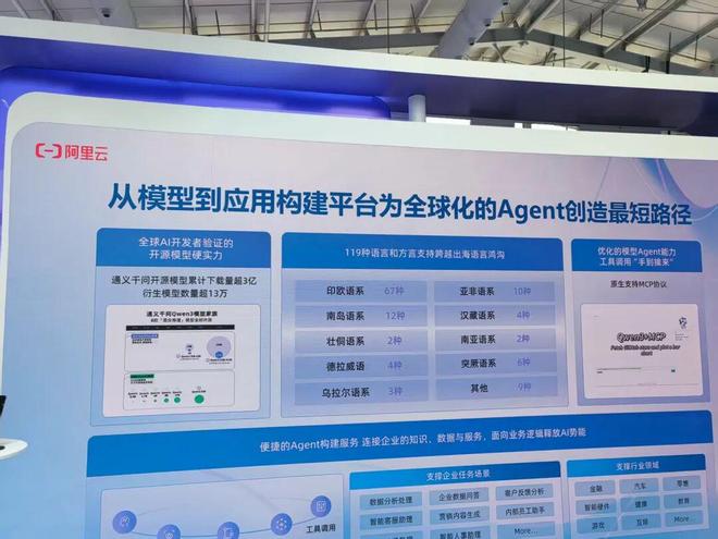 对于智能体的开发应用。戴威表示,阿里巴巴将通义千问作为集团数字化转型的核心引擎,同时向全行业输出 AI 能力,推动大模型从“实验室技术”转向“普惠化应用”。已深度渗透金融、汽车、零售、智能硬件、健康、教育、游戏等多个行业,且应用门槛持续降低,个人开发者可在5—10分钟内完成专属Agent的搭建,推动大模型应用的全民化普及。