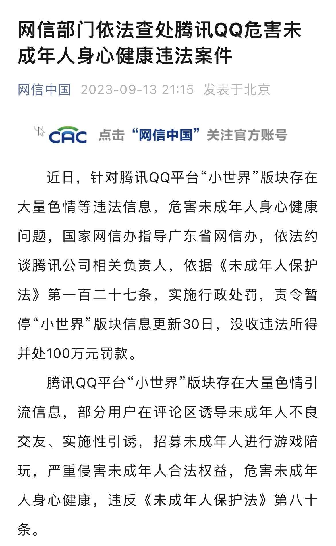 9月13日晚,据“网信中国”微信公众号消息,针对腾讯 *** 平台“小世界”版块存在大量色情等违法信息,危害未成年人身心健康问题,国家网信办指导广东省网信办,依法约谈腾讯公司相关负责人,依据《未成年人保护法》之一百二十七条,实施行政处罚,责令暂停“小世界”版块信息更新30日,没收违法所得并处100万元罚款。