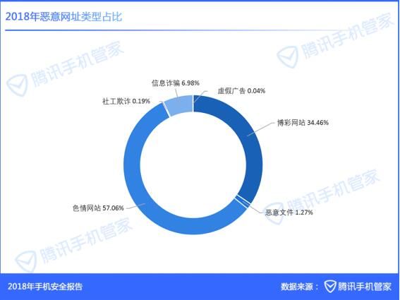 若不慎浏览恶意网址,用户手机及财产也将置于危险之中。《报告》显示,2018年腾讯安全实验室共计检测恶意网址达1.82亿次。其中,和博彩网站最为常见,占比分别达 57.06%和 34.46%。针对色情网址的安全防范,腾讯手机管家向 *** 浏览器输出了SDK能力,帮助拦截识别色情等各类恶意网址,保障用户安全浏览网页。