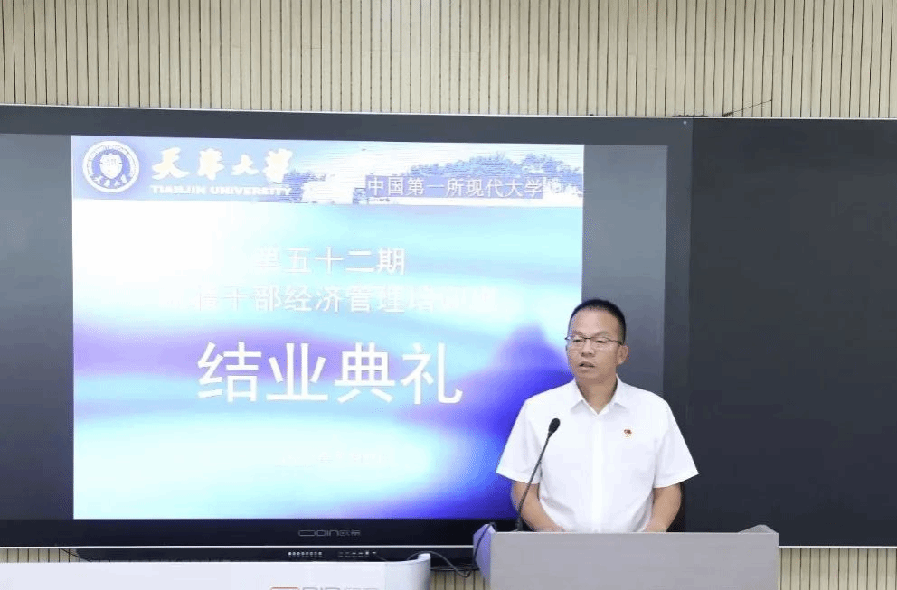 学员代表张国昌在结业仪式上发言,他代表全体学员向天津大学和经管学部致以最诚挚的敬意和感谢,他总结了三点感受:一是以学铸魂,夯实信仰与能力之基,二是开拓进取,激活高质量发展动能,三是知行合一,共绘新疆壮美发展画卷。同时他代表全体学员承诺:完整准确全面贯彻新发展理念和新时代党的治疆方略,始终把铸牢中华民族共同体意识作为主线,将天大的优良学风带回天山南北,把最新的理念融入新疆发展实践,强化担当、忠诚履职,在强国建设、民族复兴征程上贡献自己的智慧和力量,共同奏响新疆经济社会高质量发展的“最强音”。