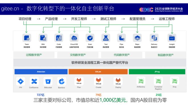 为了更好地服务中国开发者群体,同时实现开源中国的自身造血,马越还在会上分享了 gitee.cn 研发效能平台。gitee.cn 为助力中国信创的国产一体化自主创新,对标 Atlassian 、GitLab 、JFrog 三家美国上市公司的软件研发工具能力,已经实现含项目管理、代码管理、测试管理、流水线、制品管理、集成交付等软件研发全流程工具一体化国产替代平台。马越表示,目前gitee.cn研发效能平台已服务了38万家中国企业,付费用户超万家。