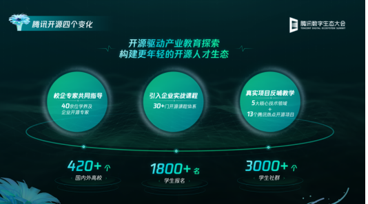 最后,是开源人才年轻化。良好的开源生态,离不开与高校的紧密合作,从2006年开始,腾讯就围绕着人才培养、联合研究、学术交流三条主线,开展腾讯高校合作犀牛鸟计划,为行业培养优秀的互联网人才。2021年,腾讯首次启动了“犀牛鸟开源人才计划”,继续与高校深入合作,帮助学生由浅入深了解开源知识,用企业真实项目来反哺教学,进一步助力开源人才生态的发展。首期计划中,一共有420所国内外高校,超过3000位学生参与。王巨宏表示,未来腾讯希望链接更多行业机构一起参与发展,为开源教育贡献更多的智慧和力量。