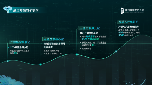 首先,是开源协同常态化。自2018年9月30日的“930”变革后,腾讯开始转变推进开源的思路,并正式把开源协同作为公司级的技术战略之一。三年过去,腾讯已经组建和孵化了117个开源协同小组,涵盖了计算、存储、数据等所有互联网基石型技术,涉及了腾讯云、微信、 *** 等所有核心业务板块。目前腾讯内部代码的开源率达到85%,不仅给腾讯带来巨大的效能提升和成本节约,也通过云助力着生态伙伴。