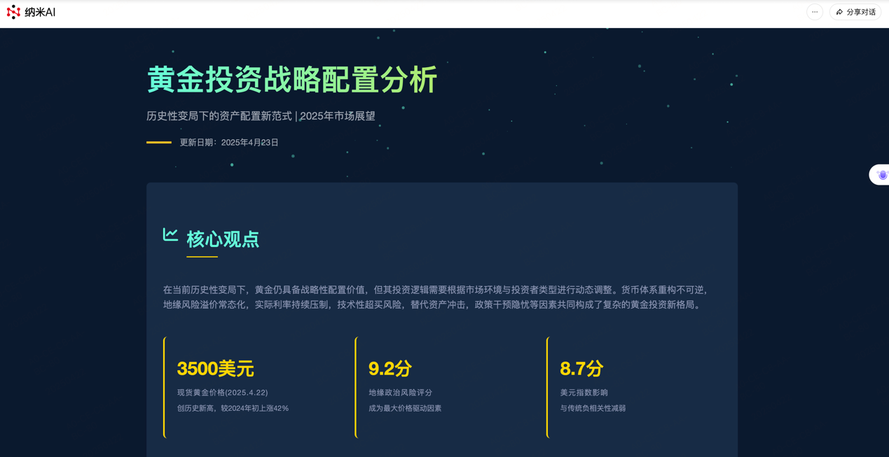 拿到邀请码后,在纳米AI客户端内找到万能工具箱,选择“纳米AI超级搜索”、“金融数据”等MCP工具,以“最近两家有外卖业务的公司正在激烈竞争,分析他们的财报,告诉我该购买哪一家的股票”为指令开始实测,调用了上述工具的大模型会自动提取两家公司的财务数据和业务发展信息,10余分钟便生成内容扎实、设计酷炫的结果;再以“黄金现在作为投资还明不明智”为指令实测,大模型给出的分析和投资建议也令人惊叹,其全面性精准度丝毫不弱于券商分析师。