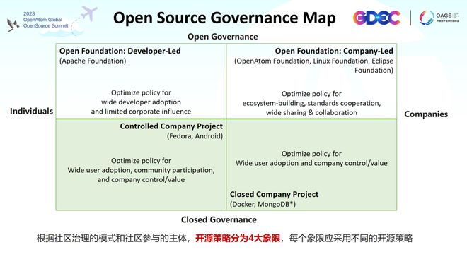 第四象限代表开发者主导的开源基金会(如 Apache Foundation),其优化政策旨在广泛吸引开发者采用,限制公司的影响力,注重由开发者主导的开放治理。