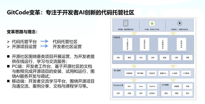 开源社区将围绕垂类项目进行运营,为开发者提供在线运行、学习和交流服务。通过 PC 端的开发者工作台,GitCode 提供基于开源社区的文档和教程,帮助开发者完成开源项目的安装、试用和运营,并支持围绕 AI 服务的开发和调试。同时,在移动端提供开发者交流学习平台,供开发者进行项目沟通交流、案例分享,以及文档和课程学习等活动。