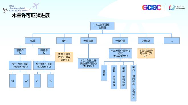 之一,全球首个中英文的开源许可证——木兰宽松许可证。从这个许可证根上长起来,现在已经拓展出许可证族。