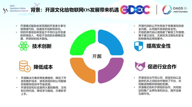 演讲中,汪礼超从四个方面与听众交流:TencentOS Tiny 的背景、项目技术特色、开源项目治理与运营实践以及未来展望。他指出,物联网行业快速发展,物联网设备的连接数增长迅猛,对物联网设备软件提出了更复杂的需求。开源文化为物联网操作系统的发展带来了机遇和挑战,激发了技术创新,增强了开发者对软件的可信性和安全性,并降低了开发成本和人力成本。