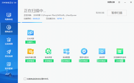 2345安全卫士提供了“闪电查杀”、“全盘查杀”和“自定义查杀”功能,可以根据自己的需要进行选择。闪电查杀比较快速,主要是扫描系统关键位置的文件;全盘查杀的时间比较长,会对系统上所有的文件进行扫描,如果介意时间比较长,可以勾选“扫描完成后自动处理并关机”。