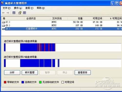 6、最后来看看整理后的使用量图,上下图对比会发现整理后的图里已经没有红色方条,碎片整理成功完成。
