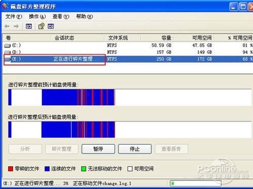 4、这时程序就会自动整理磁盘数据,红色方条代表零碎的文件,红色方条越多零碎的文件越多,越需要整理。