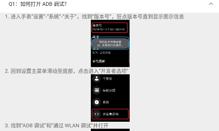 1、开启开发者模式:首先,我们需要打开手表,然后依次进入“设置” “系统” “关于” “版本号”。连续点击版本号,直到提示手表已处于开发者模式。