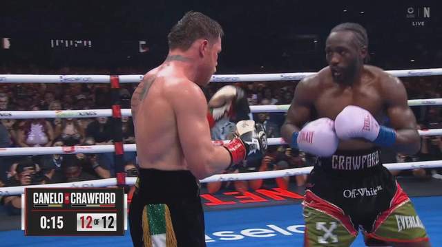 克劳福德越来越自信,阿瓦雷兹似乎到了穷途末路,孤注一掷的时候,他渴望KO克劳福德,但是做不到,臣妾做不到啊。第12回合阿瓦雷兹体力衰竭,险些被克劳福德重拳击倒。