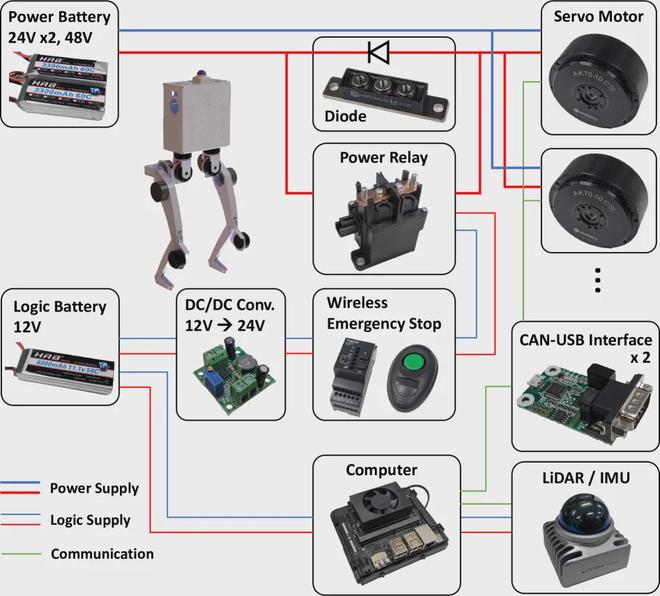 除却在机械方面追求精简,MEVITA的电路设计也体现了高度集成与务实思路。它搭载NVIDIA Jetson Orin Nano作为主控,通过CAN总线协调关节电机,并配备Livox Mid-360激光雷达,同时实现定位、环境感知与姿态测量。电源系统采用双电池方案,分别提供电机驱动与逻辑电平所需电压,并集成无线急停机制,保障操作安全。