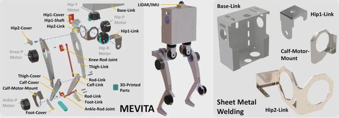 在机械设计上,MEVITA追求极简主义。它采用5自由度腿部构型,髋关节为经典的偏航-滚转-俯仰(YRP)配置,并在膝、踝关节引入平行连杆机构,有效降低运动惯量、提高响应速度。最值得注意的是,MEVITA仅凭18个独特的金属零件便完成了整机构建,这一数量远低于同类金属机器人的部件需求。这一突破性成就归功于其广泛应用的金属板焊接工艺,该工艺将传统上需多个零件拼接的复杂结构,如机器人躯干(Base-Link)和髋部连杆(Hip2-Link),成功集成为单一部件,既显著提升了整体性,又极大简化了装配流程。