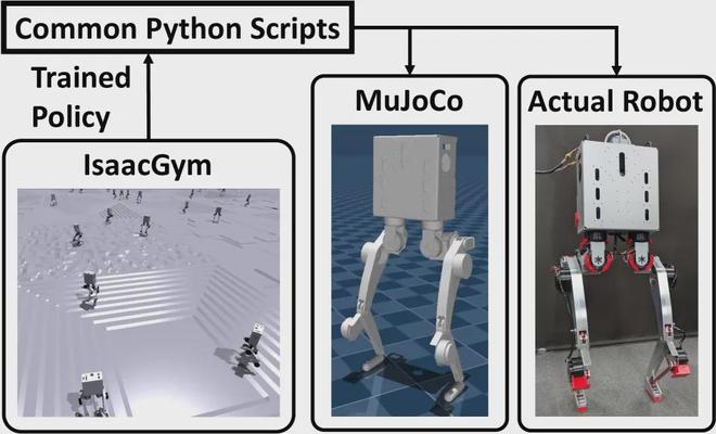 为了评估训练策略的实际应用效果,研究团队将IsaacGym 中训练完成的控制策略分别部署到 MuJoCo 仿真环境和真实的 MEVITA 机器人中,并对两者的行为差异进行了比较。