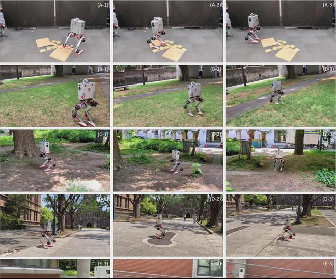 进一步地,MEVITA 在多种真实地面环境下接受了步行测试,包括室内不平整地面、草地、泥土地、混凝土砖地面和缓坡。实验表明,机器人在这些不同介质和地形条件下均实现了基本稳定的步行行为。