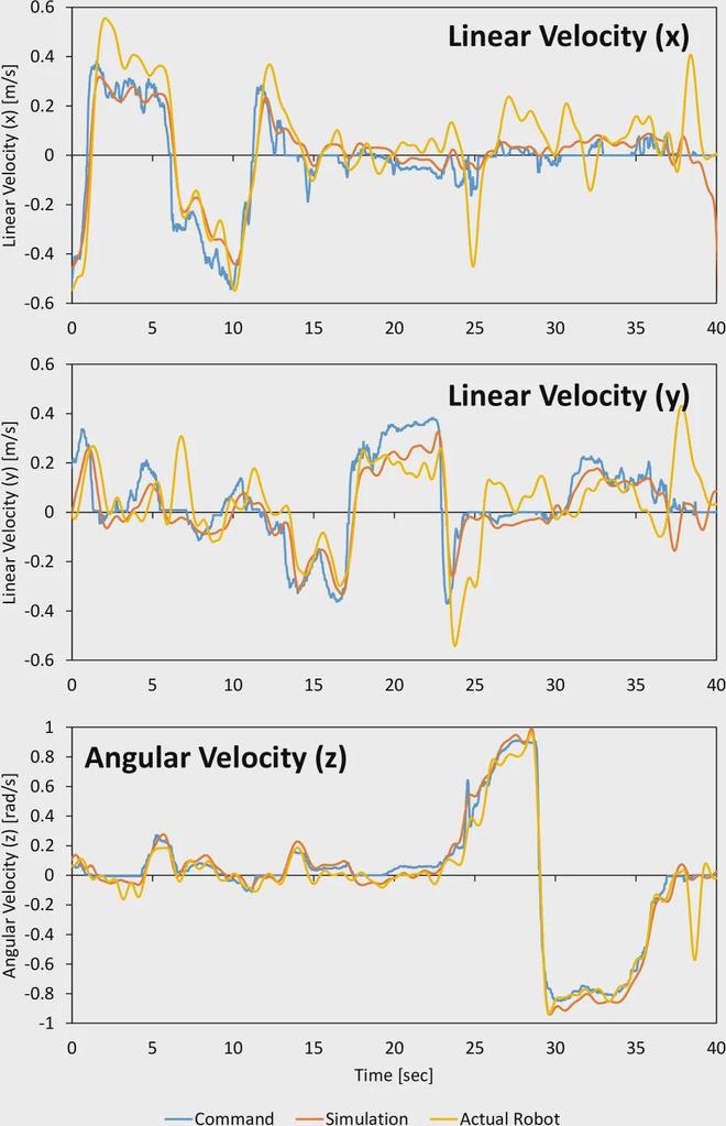 如下图所示,机器人在跟踪线性速度与角速度指令,执行前进、横向移动和旋转等动作时,能在仿真和现实环境中均能较好地响应指令。尤其在旋转运动中,仿真与实机运行结果的差异很小;而在平移运动中,实际机器人的速度误差略大于仿真环境。