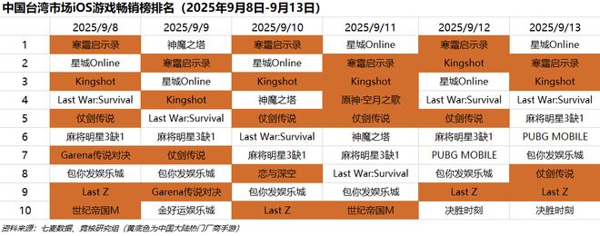 中国台湾市场2025年9月8日-2025年9月13日iOS游戏类畅销榜中,点点互动《寒霜启示录》登顶3天。点点互动《Kingshot》、米哈游《原神·空月之歌》、雷霆《杖剑传说》、叠纸《恋与深空》、Florere《Last Z: Survival Shooter》、腾讯《世纪帝国M》等游戏进入畅销榜前十,均有不错表现。