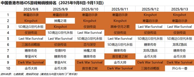 中国香港市场2025年9月8日-2025年9月13日iOS游戏类畅销榜中,点点互动《寒霜启示录》和《Kingshot》分别登顶4天和2天。雷霆《杖剑传说》、米哈游《原神·空月之歌》、灵犀互娱《救世者之树》《三国志战略版》、叠纸《恋与深空》、Florere《Dark War :Survival》等产品进入榜单Top10。