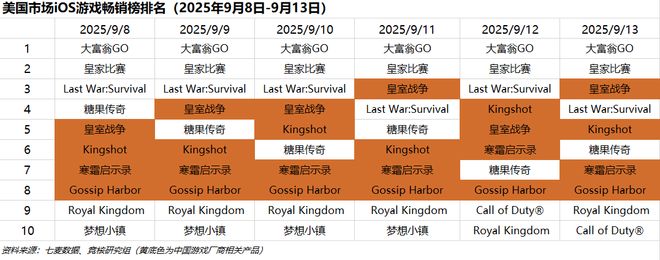 美国市场2025年9月8日-2025年9月13日iOS游戏类畅销榜中,点点互动《寒霜启示录》《Kingshot》、柠檬微趣《Gossip Harbor》等产品进入榜单TOP10。